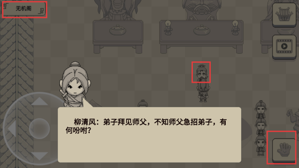 3、按照指引进入【无机阁】,找到师父后,点击右下角按键触发互动。