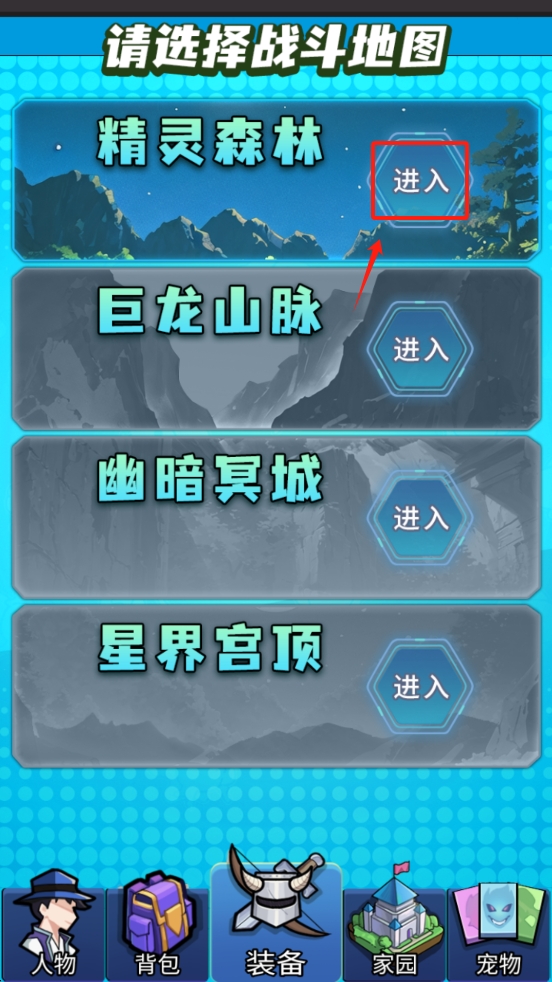 1、在地图选择界面,点击 “进入” 按钮,选择地图并进入游戏。
