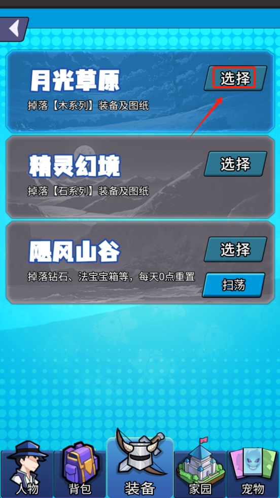 2、在场景选择界面,点击 “选择” 按钮,选择场景,准备开始战斗。