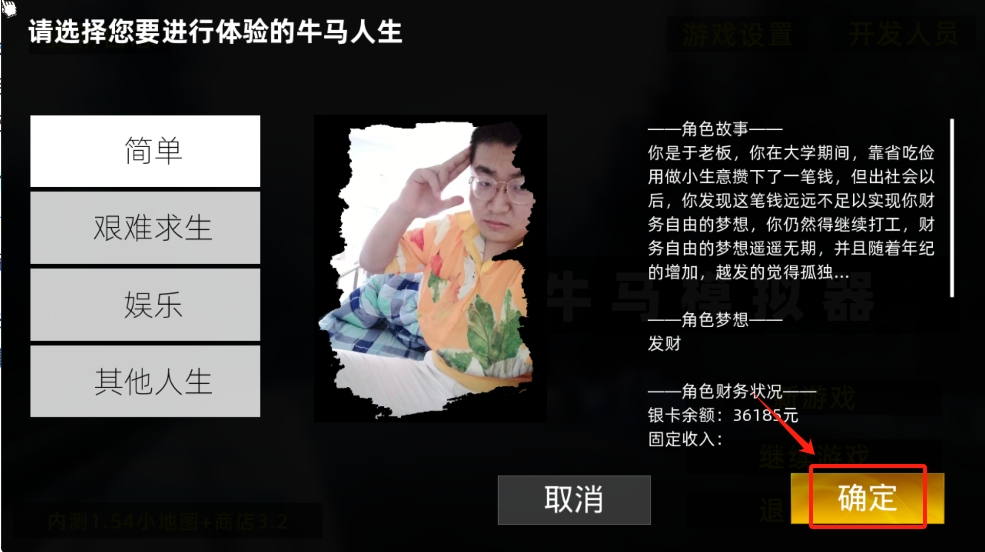 2、选择人生模式,点击 “确定” 按钮,确认选择并进入游戏。