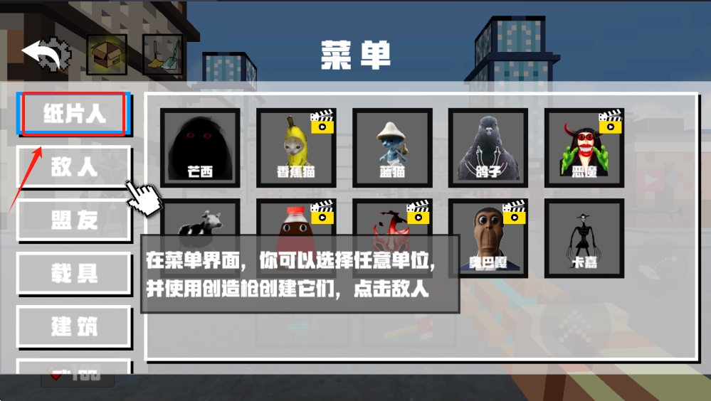 4、在菜单中选择“纸片人”。创建角色后,你就可以开始游戏了。