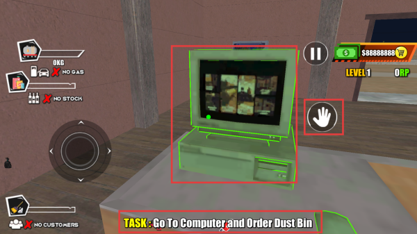 1、打开游戏,移动摇杆让角色走到电脑前,点击按键订购垃圾桶。