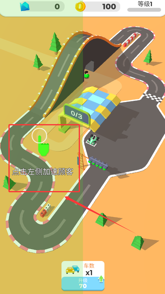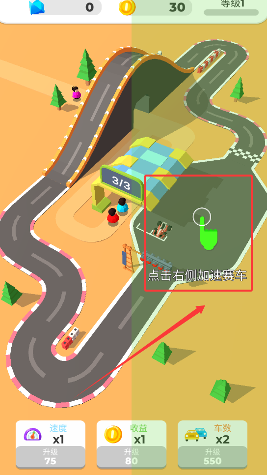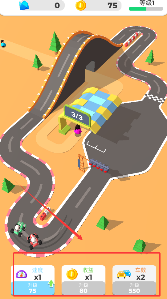 1、 核心循环围绕放置收益与主动管理展开,车辆在赛道上自动运行赚取金币。您则需要适时升级速度与数量,并扩建新的。