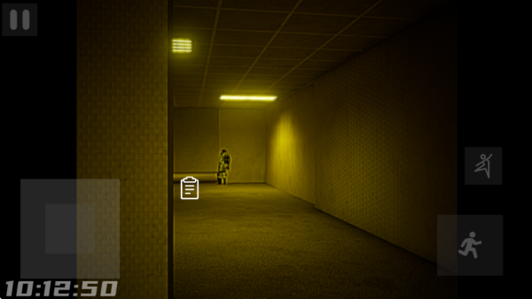 进入游戏后选择主线章节,左侧虚拟摇杆控制移动,右侧按钮负责奔跑、跳跃与互动(白色标记物品可拾取)。开局建议从低难度层级入手,熟悉“听声音辨怪物”“看灯光识危险”的基础规则,如听到管道异响需警惕狗形实体,灯光变红则立即寻找躲藏点。