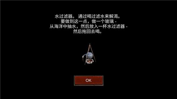 在这款游戏中人的饥饿、饥渴状态会主导你存活的时间,那么游戏中你渴了该怎么办?一起来看看吧!游戏中人渴了则需要通过喝过滤水来解渴,要做到这一点,需要做一个玻璃从海洋中抽水,然后放入一杯水到水过滤器中,然后拖回去喝。