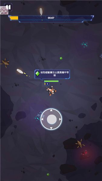 8、对战方式有点类似于割草游戏,玩家需要拾取宝石提高机甲的等级,而且。你只需要控制机甲的位移,它会自己发动攻击;