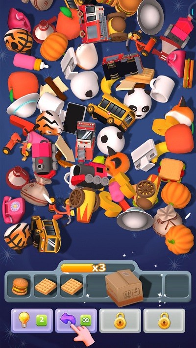 1、基础操作,轻点相邻2个以上相同物品即可合并,凑满3个自动消除,腾出空间完成关卡目标。简单的触控方式让各年龄段玩家都能快速上手。