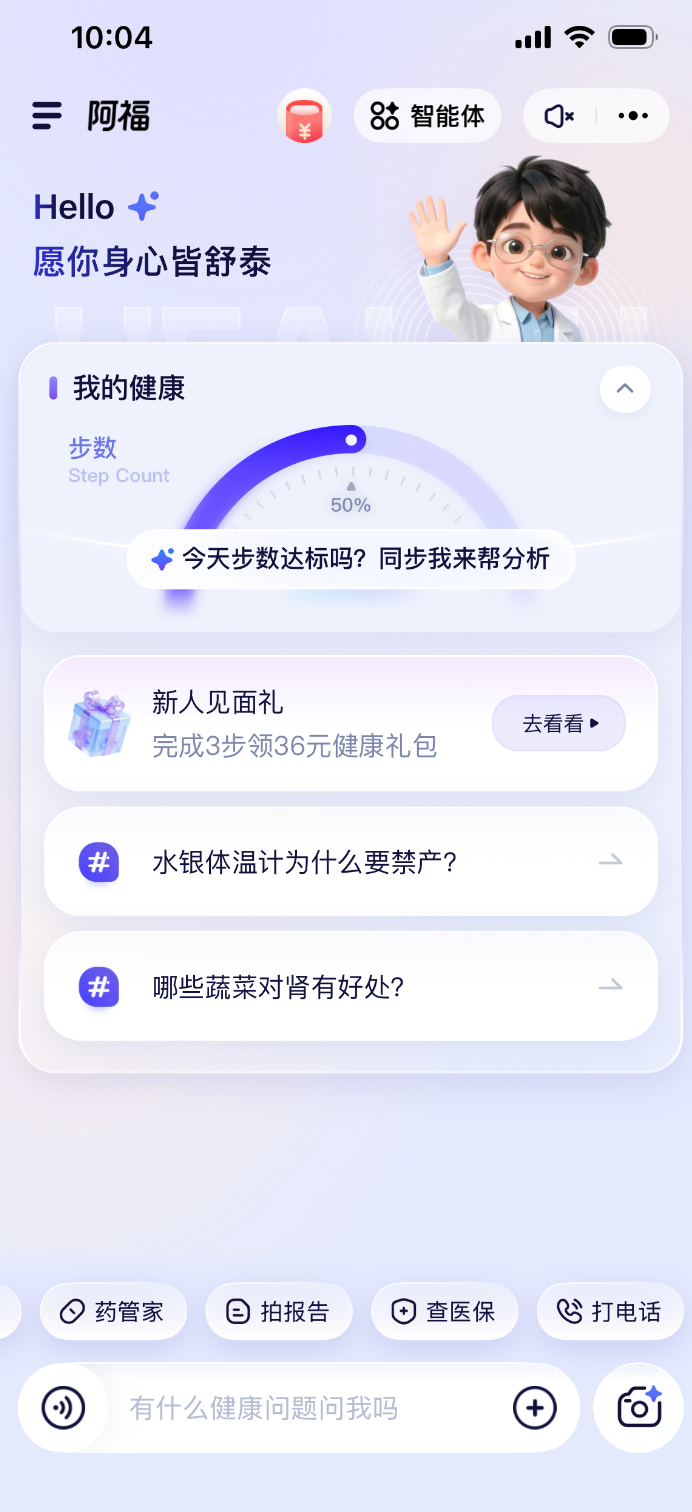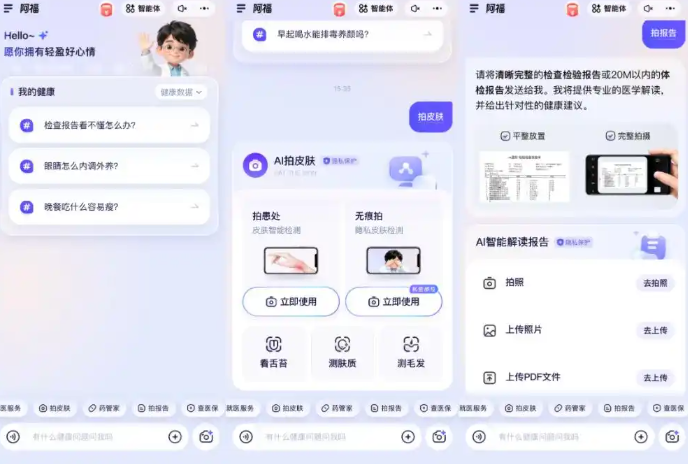 健康问答:支持语音、文字、拍照多形式提问,可精准识别50类常见皮肤疾病,解读99%常见体检报告(准确率95%以上),AI诊室模式能主动追问辅助用户清晰描述问题,提供个性化解答。