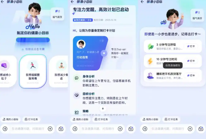 健康陪伴:通过“健康小日记”同步苹果、华为等九大品牌智能设备的运动、心率、睡眠等数据;支持设定运动、饮食等“健康小目标”,并通过“健康小提醒”每日打卡督促;可创建家人健康档案,追踪健康走势。