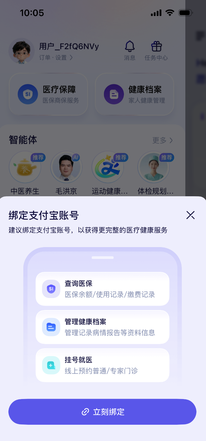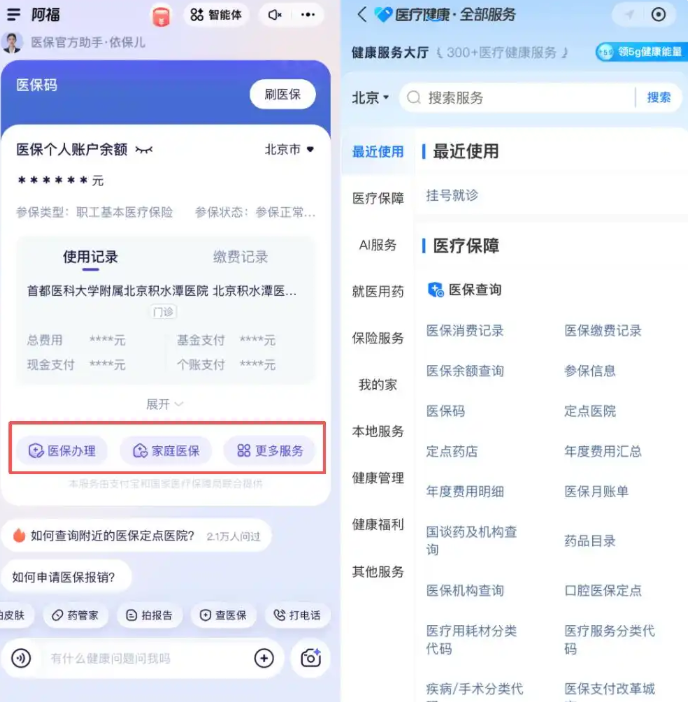 健康服务:提供亚健康自测(覆盖心理、慢病等10余项),接入30万真人医生提供在线问诊;支持全国3000+公立三甲医院挂号、在线买药,可查询医保账户并出示医保码支付。
