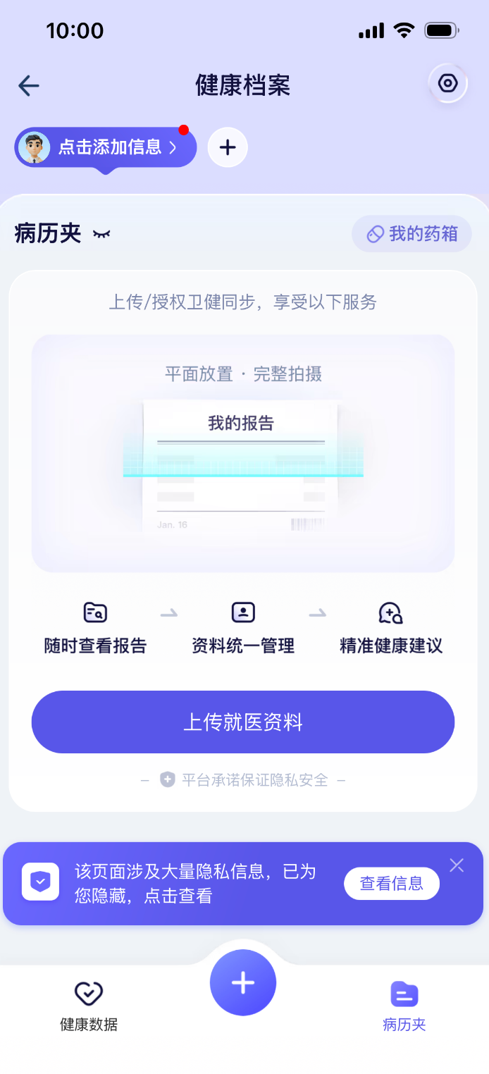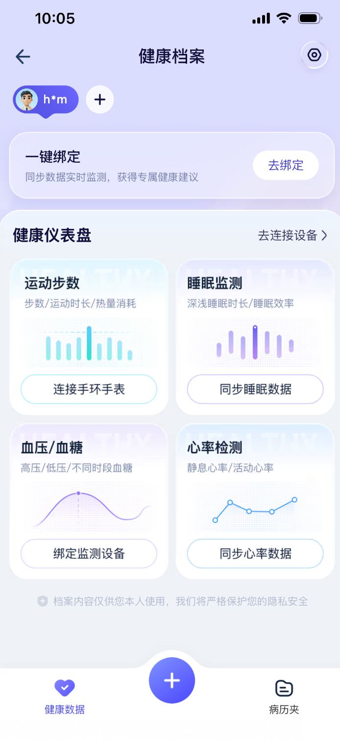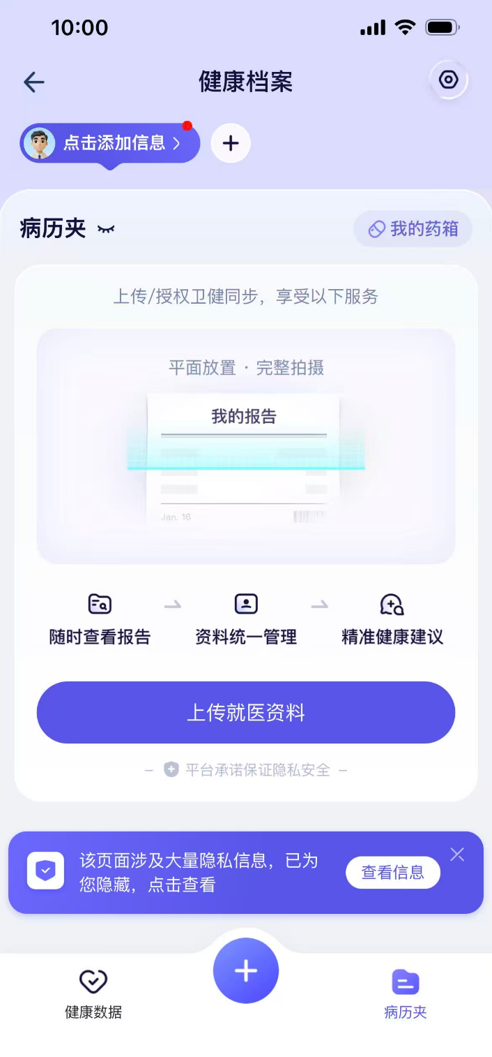 档案管理:支持拍照、PDF上传或授权导入就诊/体检数据,自动归档整理个人及家人健康档案,避免数据丢失。