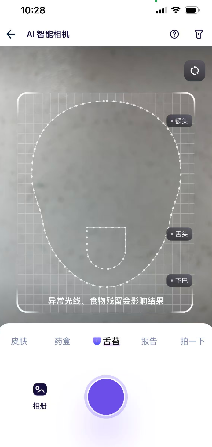 8、蚂蚁阿福app还有拍摄解答功能,用户在主界面点击相机图标,就能进入拍照模式,舌苔、皮肤、药盒、病例这些都可以拍照,上传照片后,会给用户进行专业性的回复。