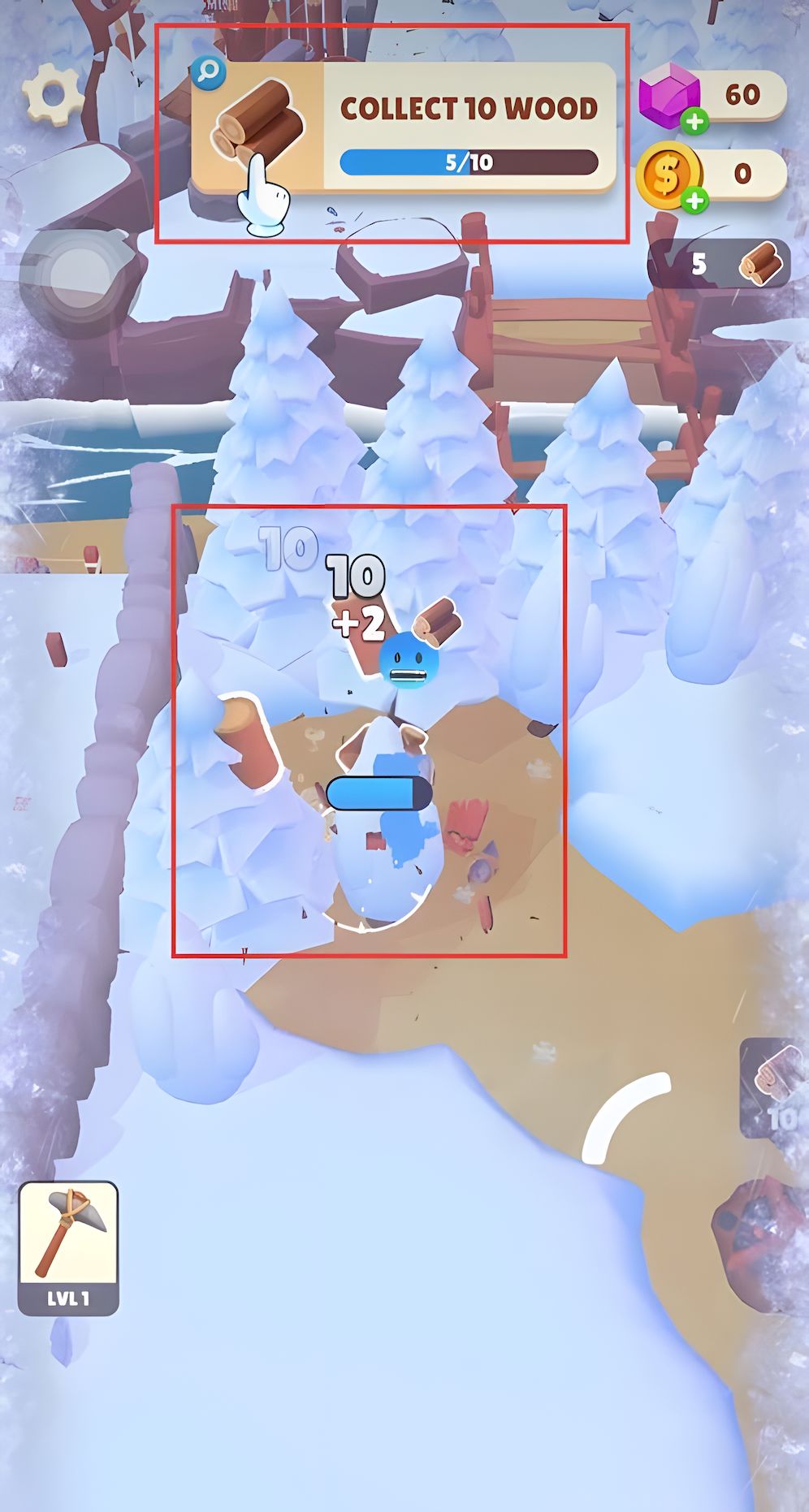3、采集木材资源,按照任务要求,抵达雪地树林区域,操控角色对树木进行砍伐,累计收集指定数量木材,推进指引进程。