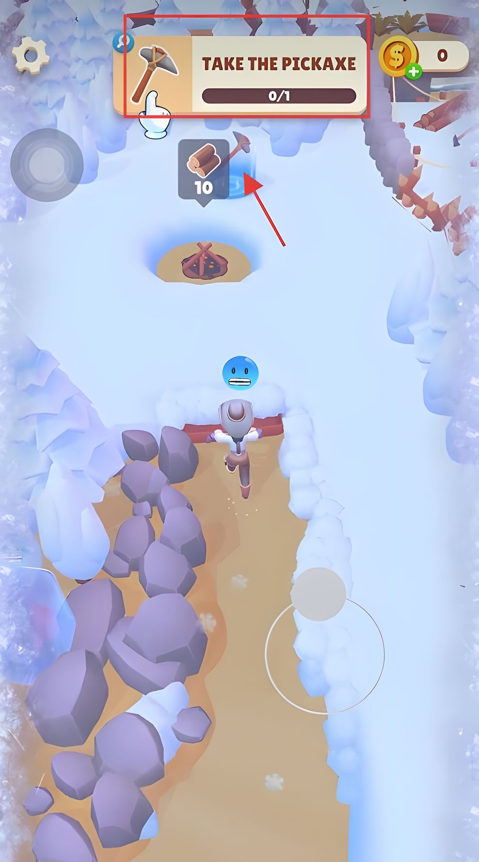 1、获取铲子工具,观察上方任务提示,操控角色移动到指定发光区域,靠近后自动拾取铲子,完成首项工具收集任务。