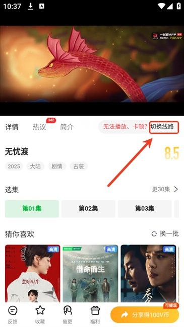 3.如果出现播放卡顿或是不能正常播放的情况时,可点击“切换线路”来更改播放路线