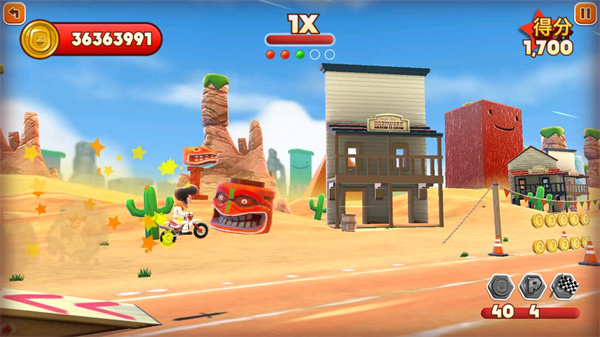 5、我们只需要控制摩托车通过跳跃或车手微蹲来躲避障碍和陷阱,同时收集途中的金币以及道具等物品,完成每个赛道的任务到达终点即可。