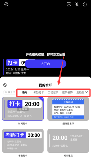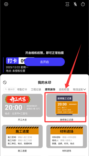 1、专业场景化水印模板,应用提供丰富的专属水印模板库,涵盖多种风格,适用于工程管理、考勤打卡、会议记录等多种工作场景。