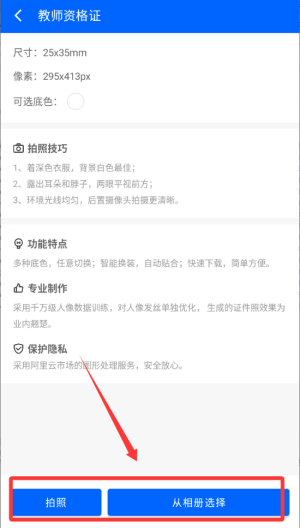 1、选择规格并导入照片,首先根据证件用途如身份证、简历照选择对应的尺寸规格,然后导入已有照片或即时拍摄一张。