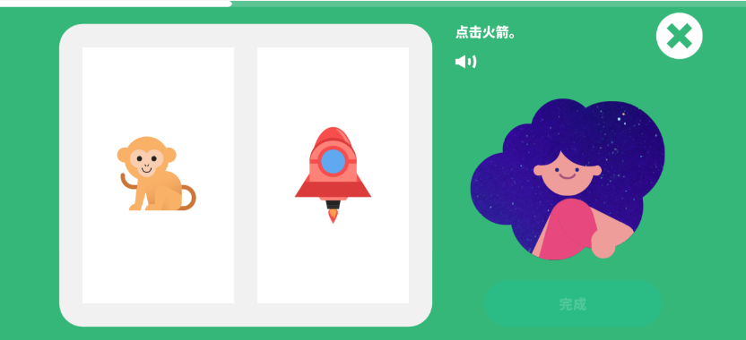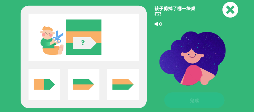 6、软件会给孩子提供不同的数学知识,空间,数字,图形。孩子选择后,点击完成,正确后进行下一道题。