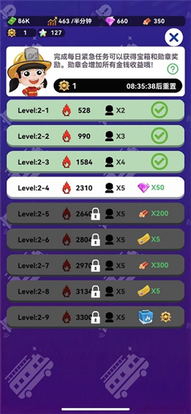5、最后一关打通才会获得勋章,累积勋章会大幅提升金钱收益,同时勋章会提升第2天的任务难度;