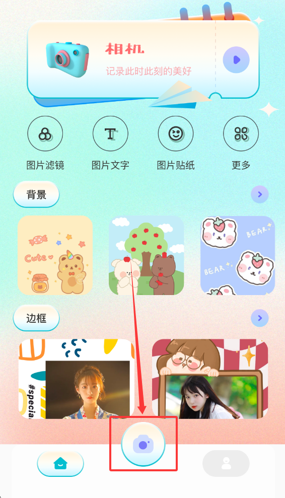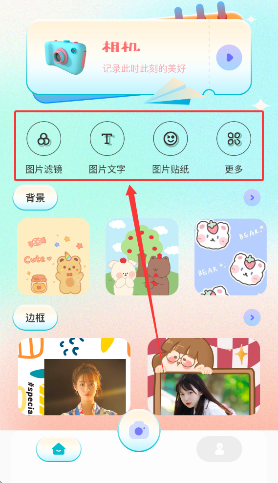2、主页提供图片滤镜调整、文字添加与贴纸装饰等图像编辑与美化工具。