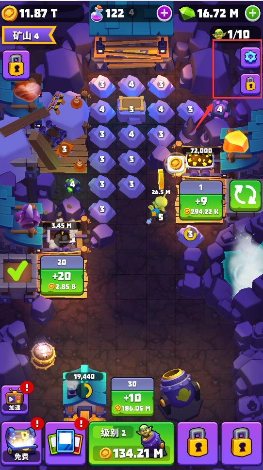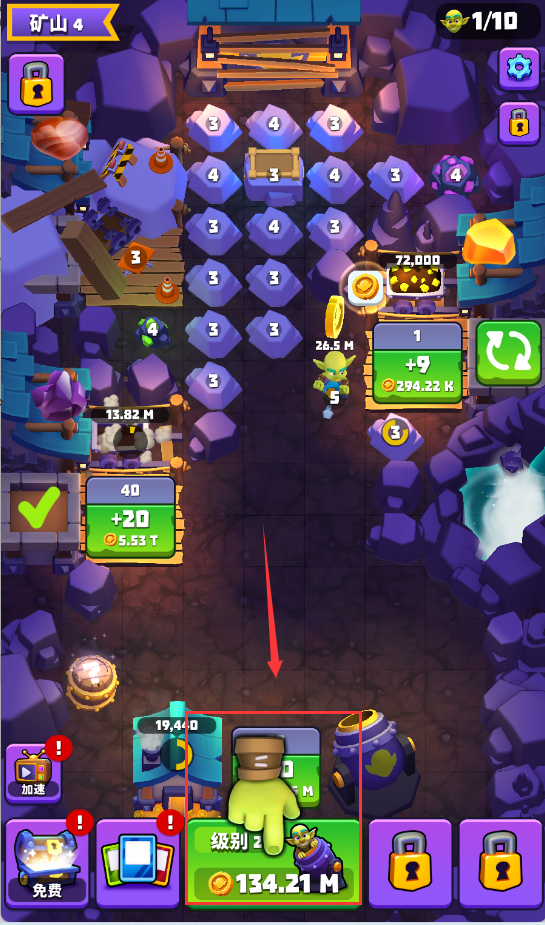 4、用获取的资源升级哥布林和工具,就能挑战更高级的矿山获得更多奖励啦。