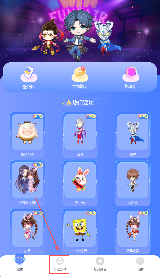 1、打开app点击下方互动宠物选项进入宠物管理界面,浏览各种宠物功能操作选项。