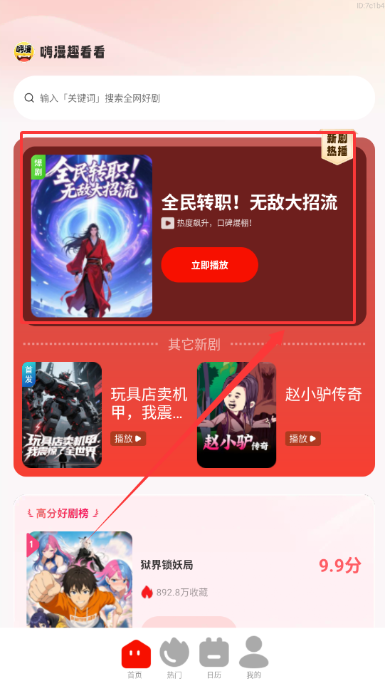 1、打开嗨漫趣看看,首页搜索栏可以找全网好剧,还能看到新剧推荐比如全民转职无敌大招流,点击立即播放就能看啦。