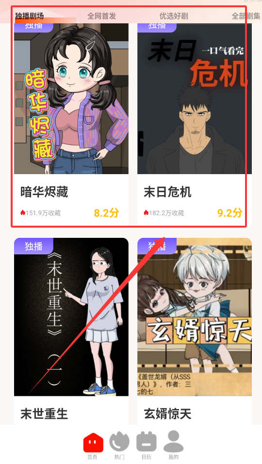 2、在首页向上滑动,有独播剧场等多个分类标签,能看到更多带评分和收藏量的剧集,比如暗华烬藏有151.9万收藏和8.2分。