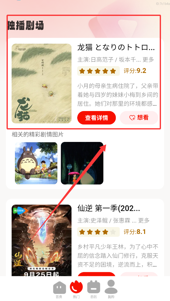 4、在独播剧场里选择剧集如龙猫,查看详情了解主演和评分等信息,点击即可观看,底部导航能方便地切换首页、热门等页面。