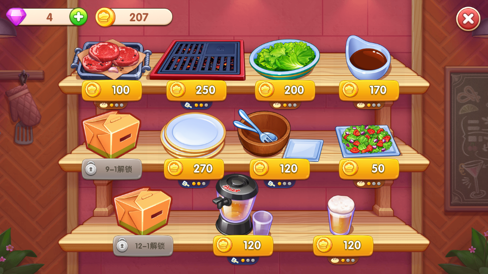 6、升级厨具提升出餐效率,升级食材品质,助力提高金币收益。