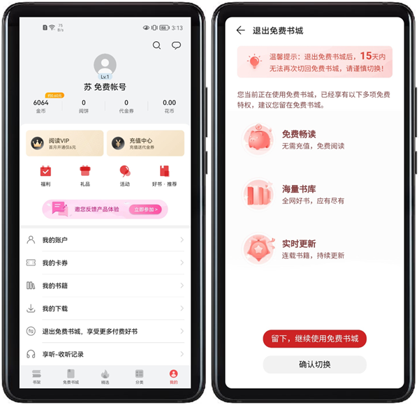 点击阅读 > 我的 > 退出免费书城,享受更多付费好书,即可退出免费书城。目前不支持退出免费书城后15天内,再从付费书城切换至免费书城。