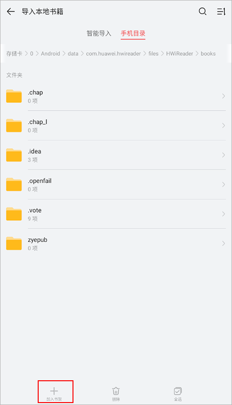 2、进到导入界面,可以选择智能导入或从手机目录导入,选择书籍并点击添加就好了。