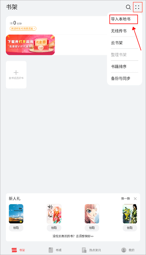 1、首先点击上方的四个点图标,选择其中的“导入本地书”。