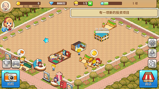3、扩大你的商场,升级店铺与服务,投资赚取金币!